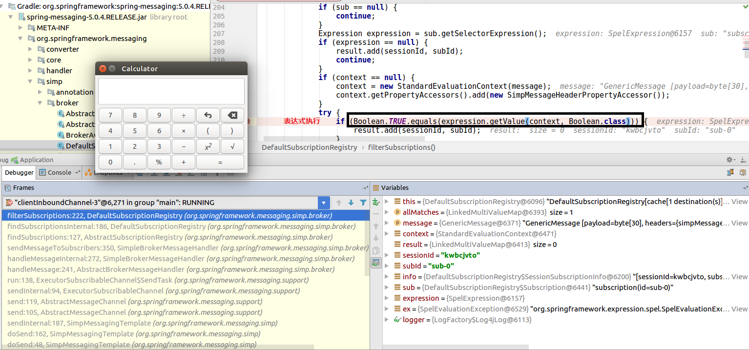 点击send向服务器发送任意消息。Spring 在向订阅者分发消息时会调用filterSubscription对消息进行过滤,会执行expression.getValue(context, Boolean.class)造成任意命令执行