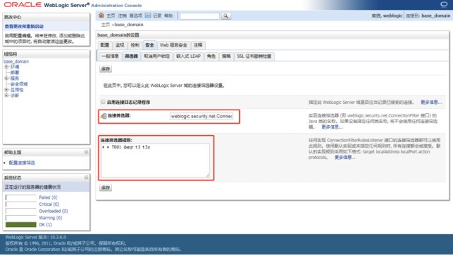 - 在连接筛选器中输入:weblogic.security.net.ConnectionFilterImpl,在连接筛选器规则中输入:* * 7001 deny t3 t3s